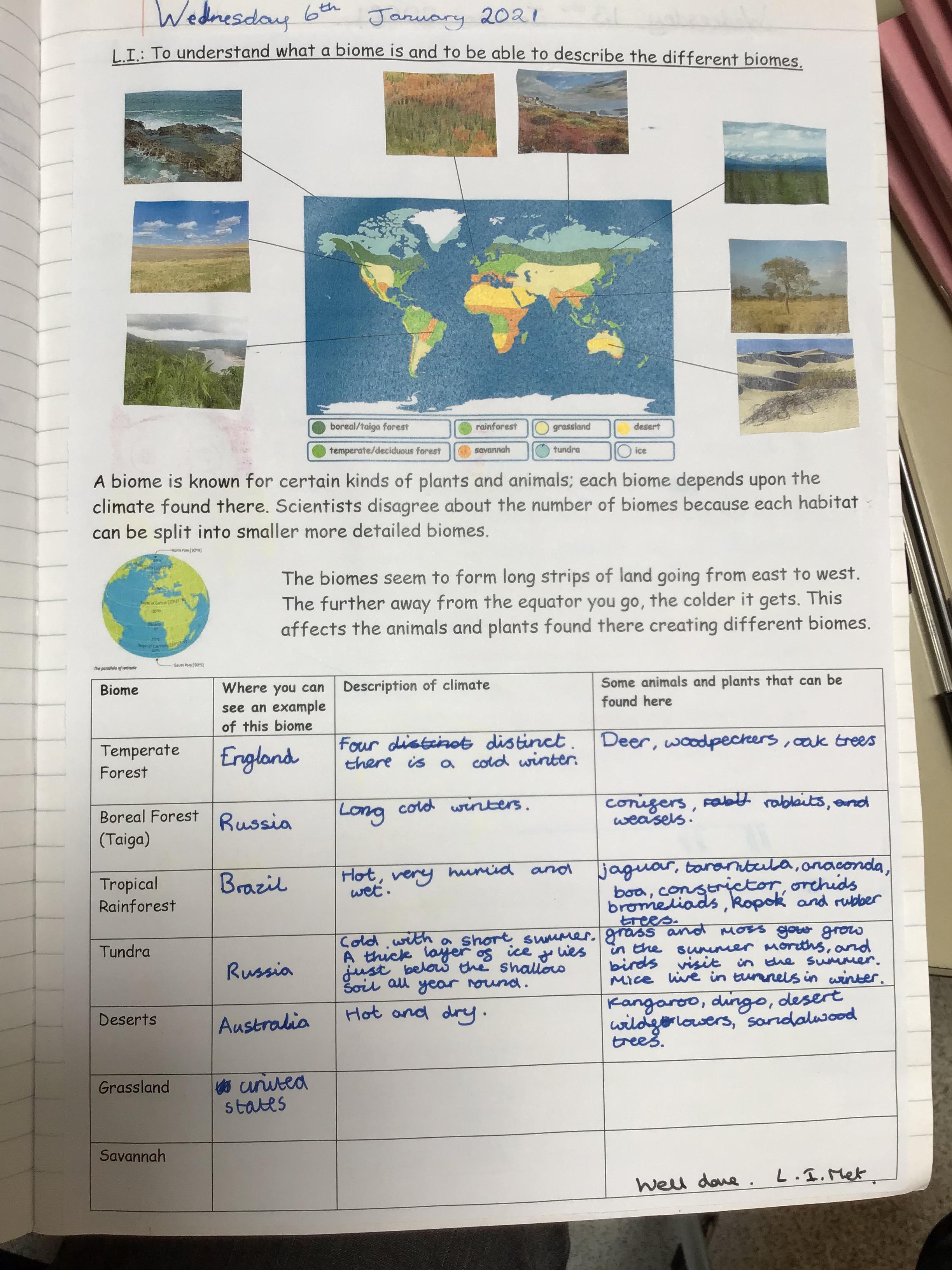 Moving from the studies of seasonal weather patterns, hot and cold parts of the world, and contrasting localities in Key Stage 1, Year 3 sees the introduction of the terms climate zone and biome: the children will study different biomes as they progress through the key stage, including the ocean biome, forests, deserts and savannah.
