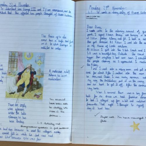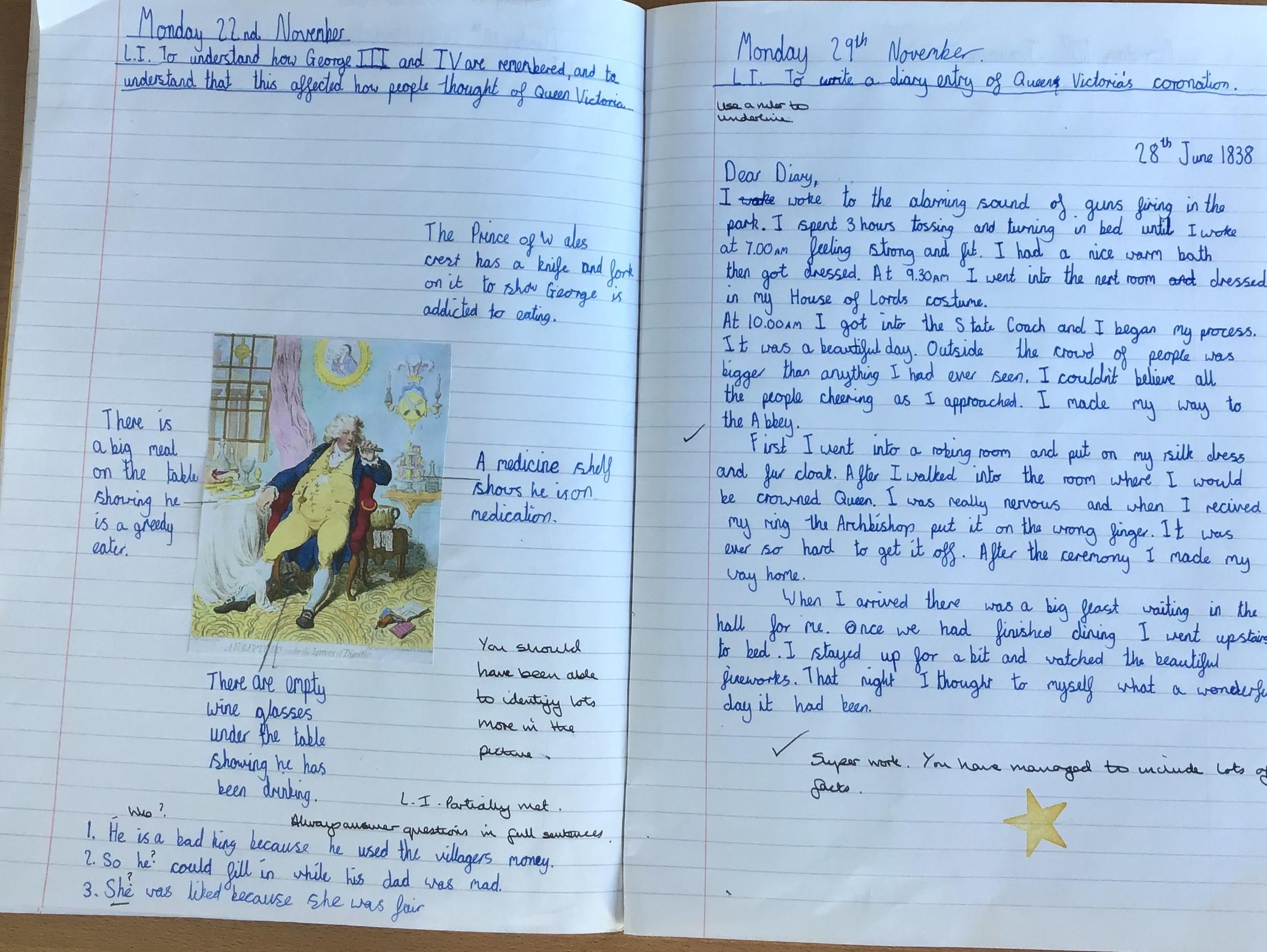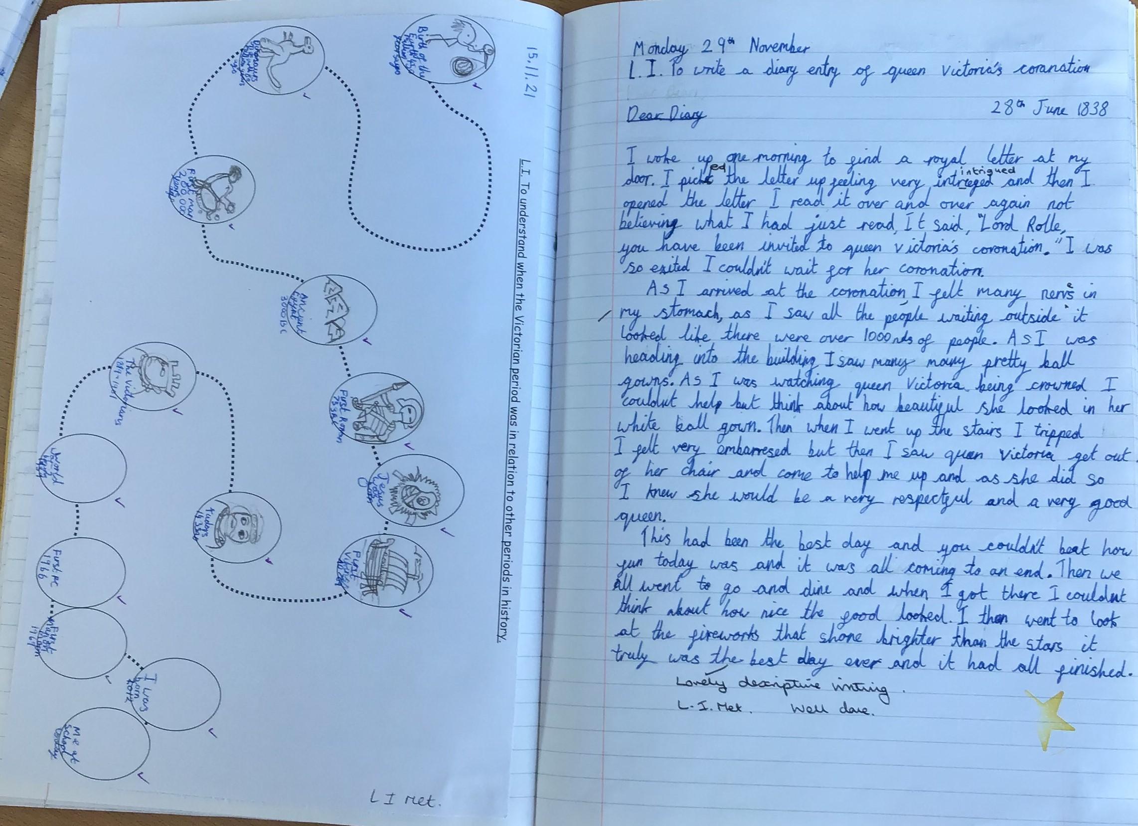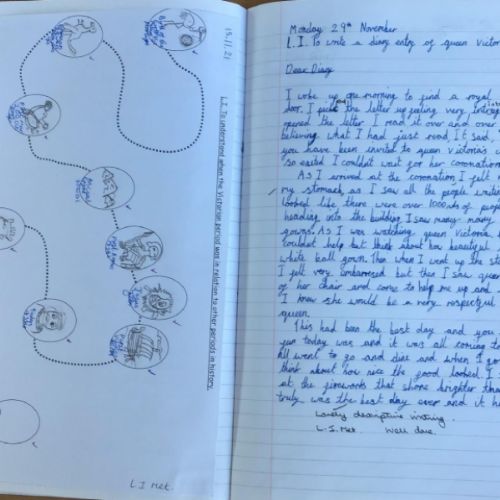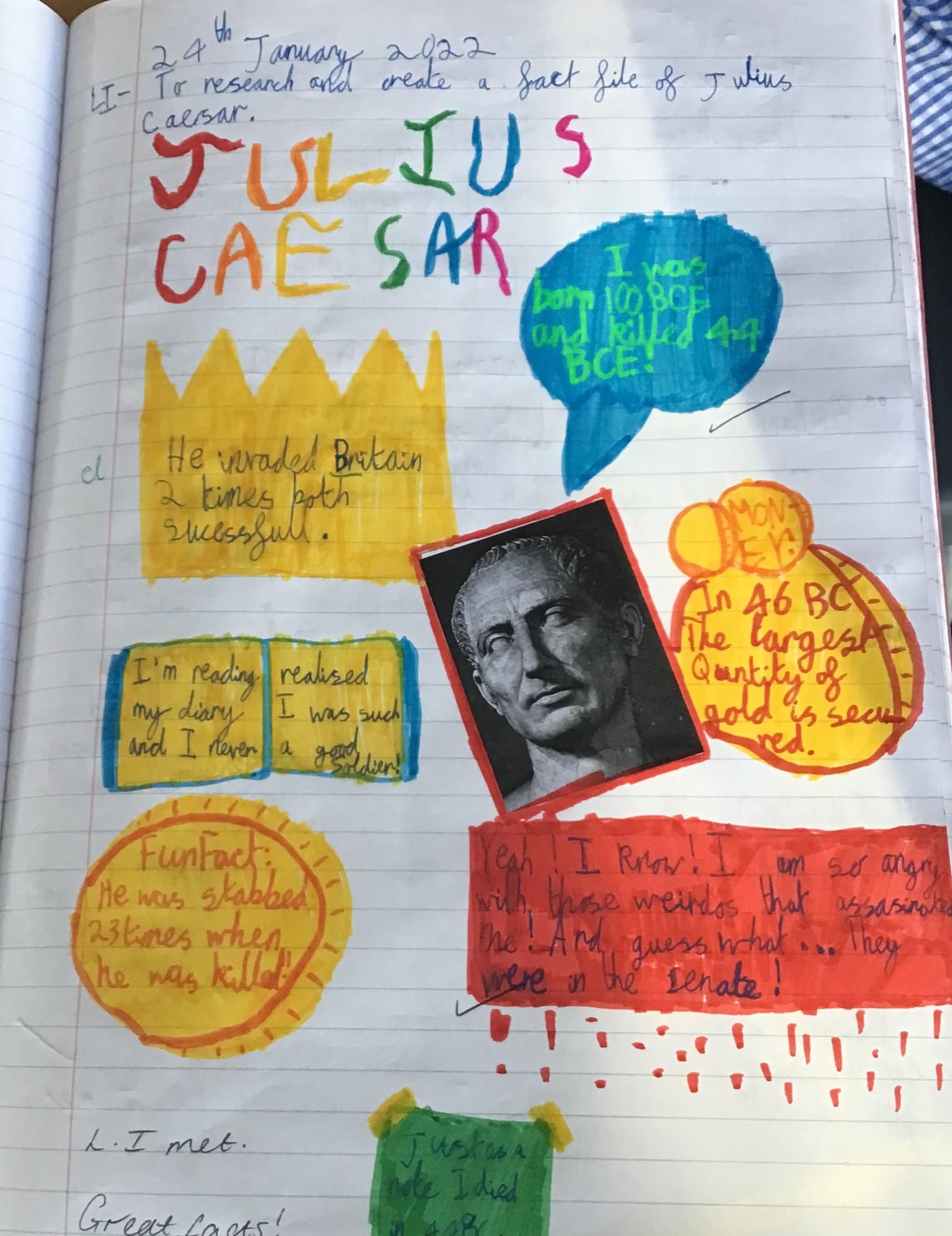 All classes in both Key Stage 1 and 2 alternate the terms with history and geography themes. The term in which history is taught, lessons are weekly and generally 90 minutes in length, however some classes will block their learning.   Children have the opportunity to work alone, in pairs or as part of a mixed group when working on projects, reading or fact- finding tasks. Children are encouraged to use computers, the library, artefacts and interact respectively with outside agencies that are invited in. They will be able to retain information from experiencing first hand life as a Roman or Ancient Greek person.  They are also encouraged further up the KS to question sources of information and relate knowledge to other areas of learning. They will have an understanding of certain significant events and when chronologically they took place.