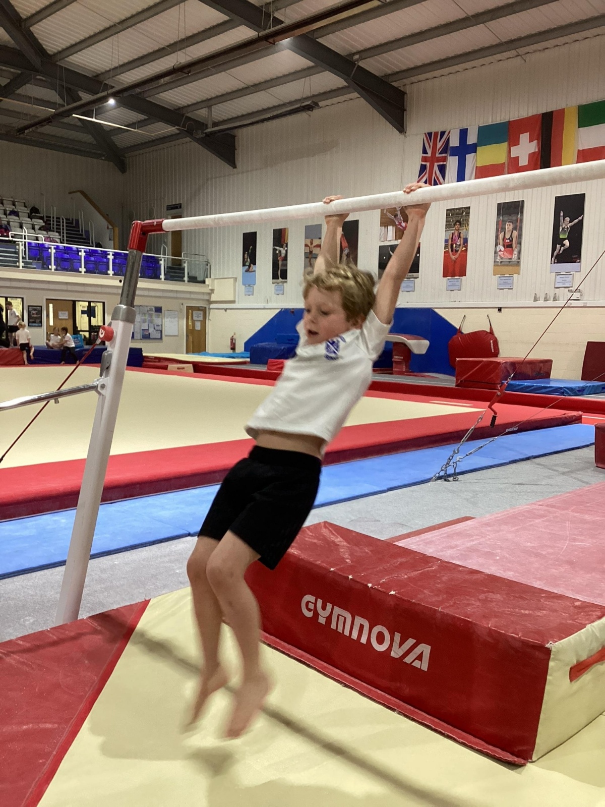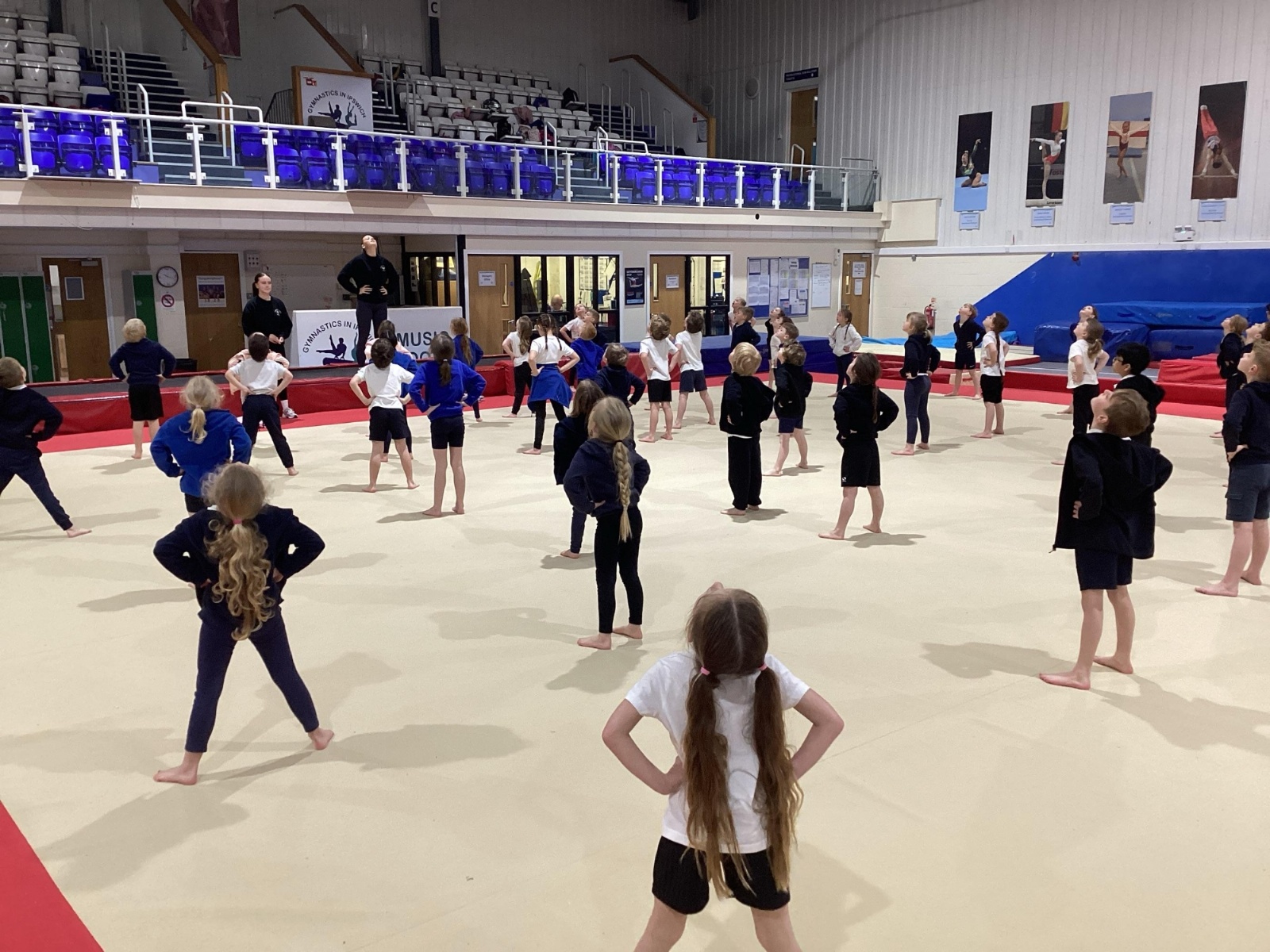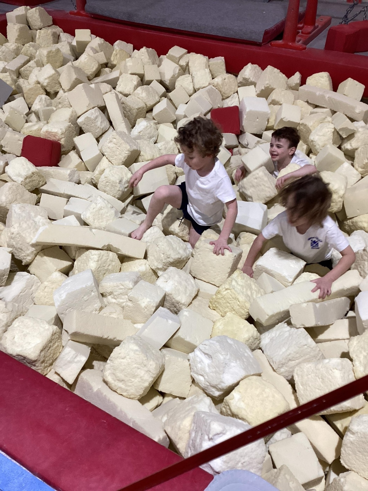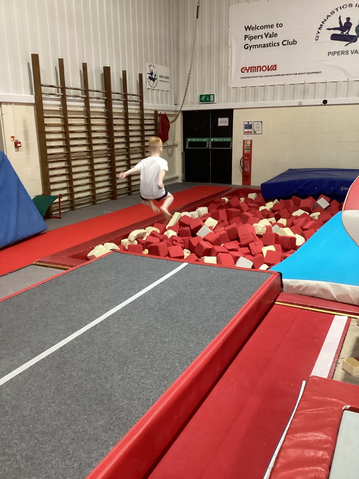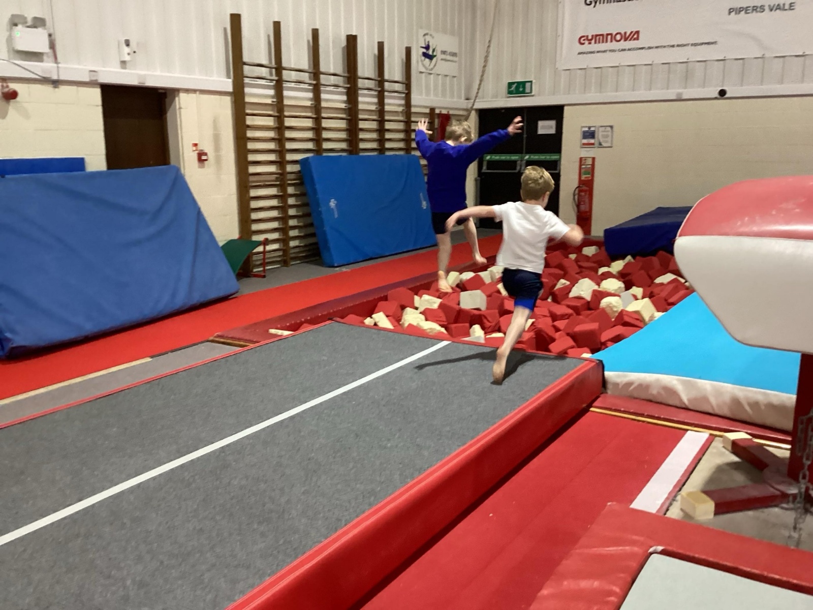 The session began with an energetic floor warm-up led by the centre’s staff, before the children were organised into groups. They then rotated around different activities, including balancing on beams, working with hoops, practising their jumps, and diving into the foam pit.